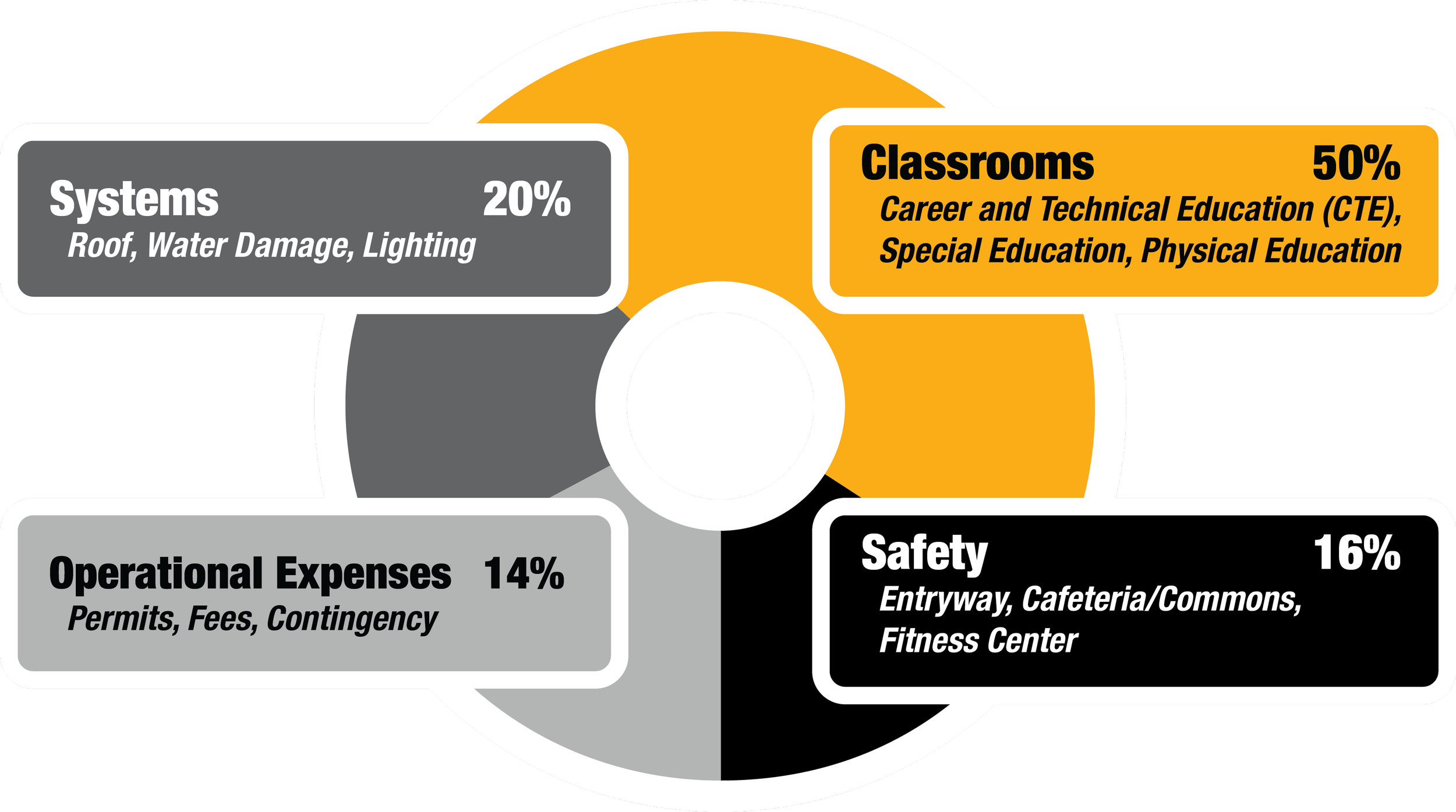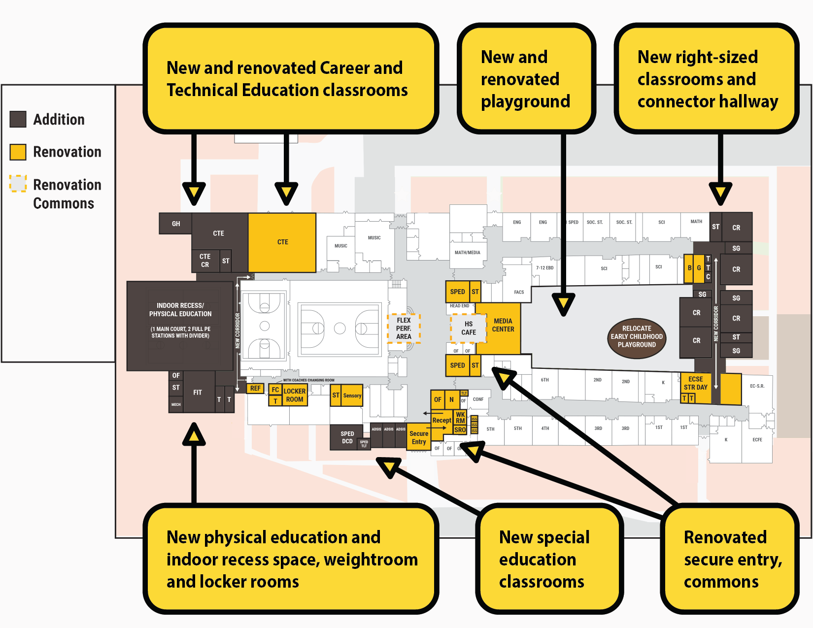Additional classrooms for career and technical education, larger special education rooms, small group rooms, additional right sized general classrooms, storage space along, a new secondary corridor connection